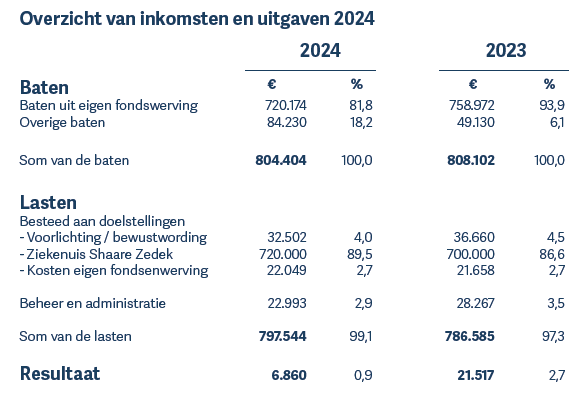 De verkorte jaarcijfers vindt u onderstaand afgedrukt. Het boekjaar van de stichting is gelijk aan het kalenderjaar. Naast de controle door de accountant vindt er tevens controle plaats door het CBF, toezichthouder goede doelen. Deze controle door het CBF is voor u als (toekomstige) gever een extra zekerheid dat uw gift (en) maximaal voor het doel bestemd worden. Dit waarborgt tevens onze ANBI status. De totale bestedingen aan de doelstelling in % van de totale baten was in 2024 het mooie percentage van 96% . Dit % ligt 2% hoger dan in 2023. Namens het bestuur wil ik u, na de Heere, hartelijk dankzeggen voor al uw bij dragen in welke vorm dan ook. Ook hier geldt: dank God in alles. Dit geeft nieuwe energie om samen met u dit dankbare werk in het huidige jaar en de jaren daarna, als God het geeft , te mogen blijven doen.